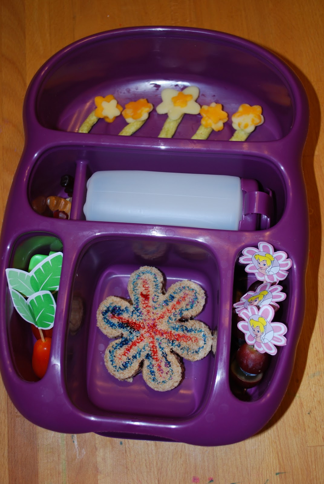 First off: found this super cool container yesterday while out running errands. And only $5.99! The Stay-Fit Lunch 2 Go container has an icepack in the lid, 3 compartments & a tray on top for small snacks or cutlery. It is much smaller than our Goodbyn boxes. (This actually fits in M's lunchbox.) I also like the larger compartment for a sandwich. (The Goodbyn boxes are hard to fit a full size sandwich. For example for this lunch I would have had to split the sandwiches up between the top compartment & the lower square.) The box does not have a space for a water container however.